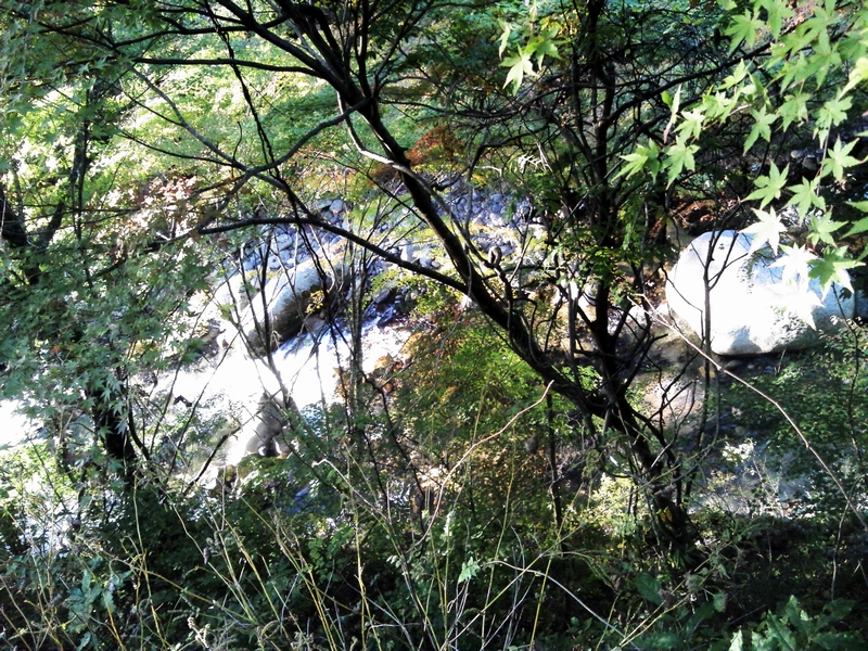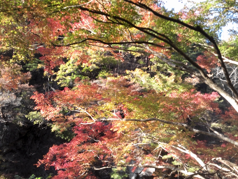 渓谷全体を見渡すと、色づいた木々も見られます。 1本1本の木を見ると、随分と見事に紅葉したものも。 山に目を向けると、高いところはそれなりに紅葉しています。