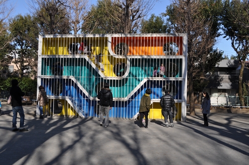 ちょっと珍しい、上下方向の迷路。なんと出口は一番下に子供しか入れない大きさのがあるだけ。大人は助けに入れない。でも、それを見守る大人。2歳のソラくんも無事に上まで行って帰ってきたよ。