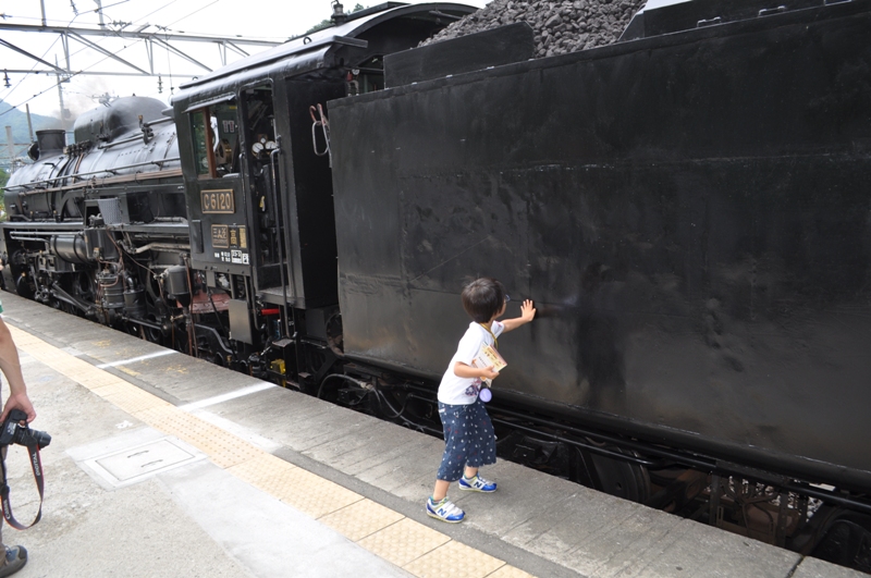 横川駅。いましたいました。SLです。今日はC61がいます。せっかくなので、入場券を買って至近から見学。もちろん都心よりは涼しいといっても、真夏の昼間が涼しいはずもなく、機関車のそばは焼けるように暑い。それでも、(物心ついてから)初めて実物のSLを見る下の子(2歳)は大はしゃぎ。上の子(5歳)は昨年も大井川鉄道でSLを見ているので、それほどでもない・・・が、気づくと手が真っ黒!どうやら車体に触ってきたらしい。