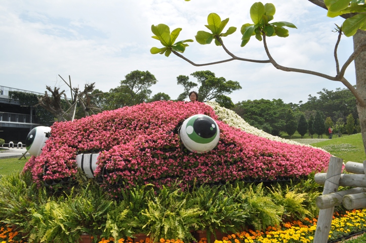 公園の中ほどまで進んだところで、ピンクの花がぎっしり詰まった大きな花壇(?)に向かって、何人もの人が写真を撮っています。 「あれ、ジンベイザメだよ!」 と、コウくん。 どうやら、かなり興奮しているようです。これ、後ろに階段がついていて、ピンクの花で作られたジンベイザメの背に乗ることができるんですね。よくできてます。その名も、花ジンベイ。