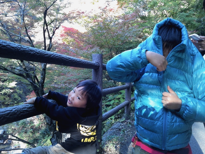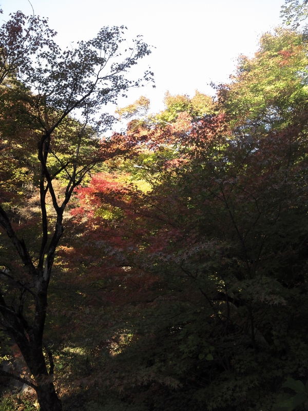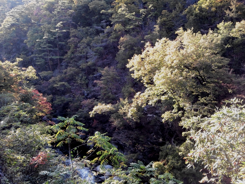 渓谷全体を見渡すと、色づいた木々も見られます。 1本1本の木を見ると、随分と見事に紅葉したものも。 山に目を向けると、高いところはそれなりに紅葉しています。