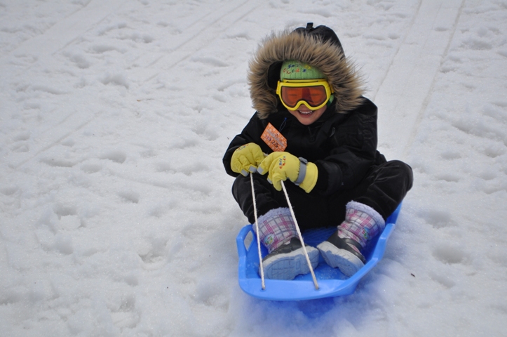 同級生には、すでに滑れる子もいるという話ですが、いまだに怖がって、板をつけようとしてくれない5歳のコウくん。今日もそりすべりにキッズゲレンデへ向かいます。