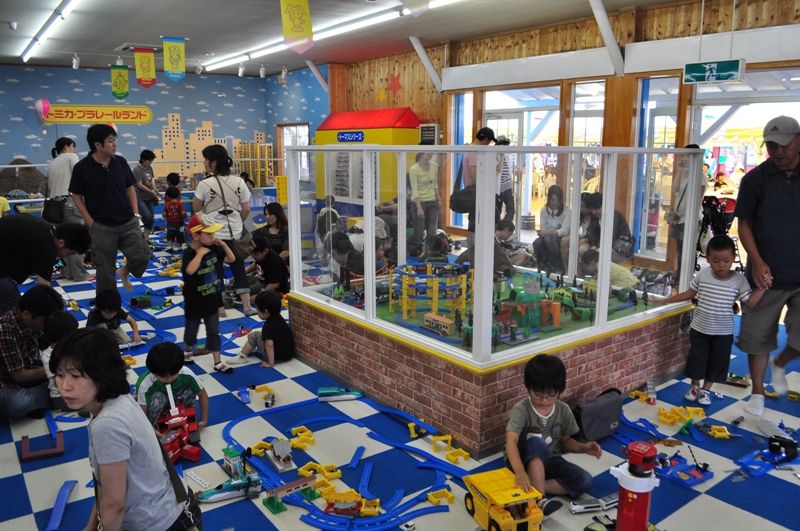 パビリオンというと万博の時に設置される大きな屋内アトラクションを想像するのは年のせい?実際は学校の教室を2つくっつけたくらいの広さにカーペットが敷かれていて、訪れた子供たちが自由にプラレールで遊ぶことができるようになっている。レールは豊富にありむしろスペースの取り合いという感が否めない。奥に玩具売り場のディスプレイのようなジオラマがあるが、皆自分が作るのに夢中で、ほぼ誰も見ていないのはとても悲しい。