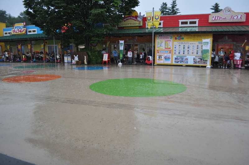 プラレール館に入って3時間。下の子はお昼寝。上の子はエンドレスで遊んでいたがようやく説得に応じ、外に出ることに。雨のおかげで人もずいぶん減り、乗っていないアトラクションを次々こなす。まだまだ名残惜しそうだったが、そろそろ蛍の光が流れてきたので、退園することに。