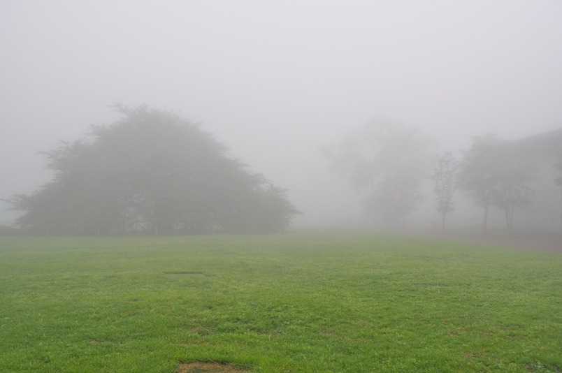 パン屋で休憩。その後、スワンに乗りたいというので、芦ノ湖へ。でも、あまりの霧でボートも中止。手前200mくらいから湖側をみて、こんな感じ。晴れていれば、この先に桟橋が見えて、芦ノ湖の景観が広がる・・・はず。