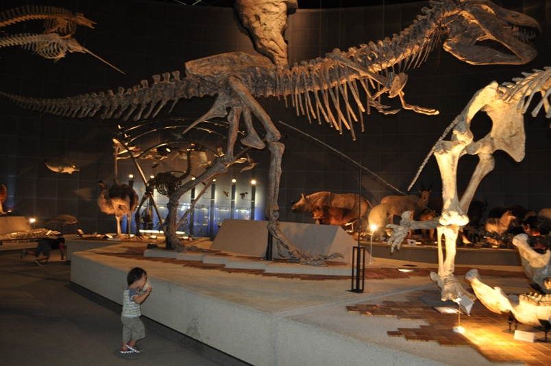 14時からの15分シアターを見て(パパは仮眠を取って)、いざ展示場へ。恐竜と剥製が所狭しと展示されていて、なかなか見ごたえがある。子どもも大喜び。