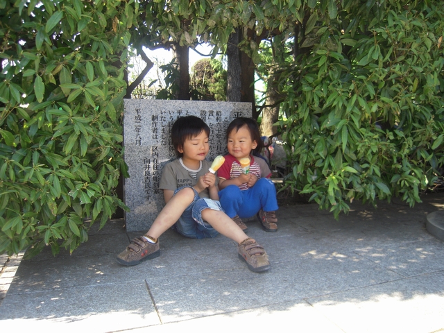 公園の中ほどまで進んだところで、ピンクの花がぎっしり詰まった大きな花壇(?)に向かって、何人もの人が写真を撮っています。 「あれ、ジンベイザメだよ!」 と、コウくん。 どうやら、かなり興奮しているようです。これ、後ろに階段がついていて、ピンクの花で作られたジンベイザメの背に乗ることができるんですね。よくできてます。その名も、花ジンベイ。