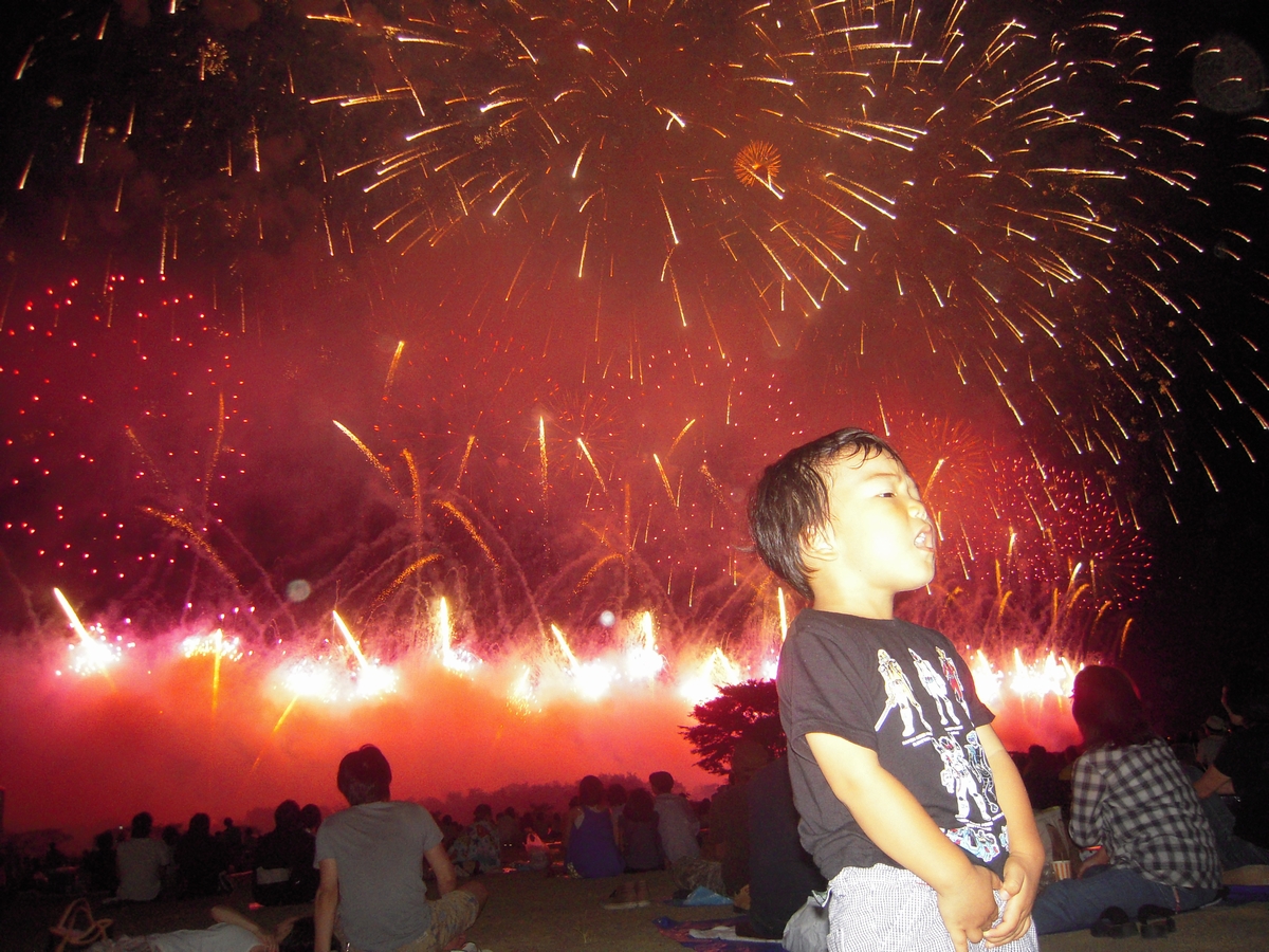 今年の花火は、割り物(尺玉の1発もの)以外の全てが音楽連動でした。 オープニングから、超ワイドのスターマインでスタート。 競技のスターマインも、音楽に合わせたせいか、ストーリーがあります。 中間の市民花火は、中央の半分くらいしか使わないワイドスターマインでしたが、これでも普通の花火大会と比べると十分に巨大で、写真を撮ろうにもファインダーに収まりきれません。燃えさかる火焔がバックに映ります。 そして、感動のフィナーレ。 さらにその後に、復興祈念の超ワイドスターマイン+2尺玉×3発。 これほど質の高い、まん丸の2尺玉を見たのは初めてです。